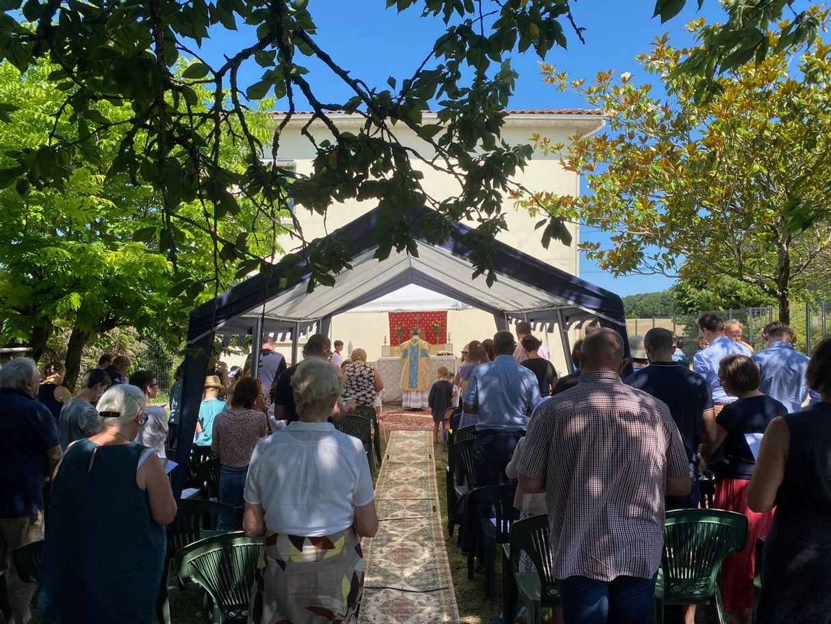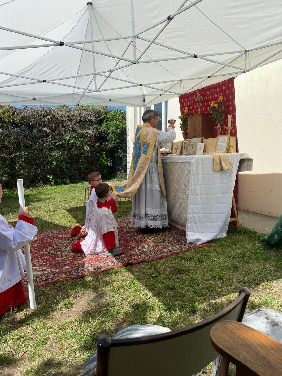 Présentation de la vie de chaque Saint Patron par nos écoliers, tableau d’images, litanie des Saints, dans la joie et sous un soleil radieux.